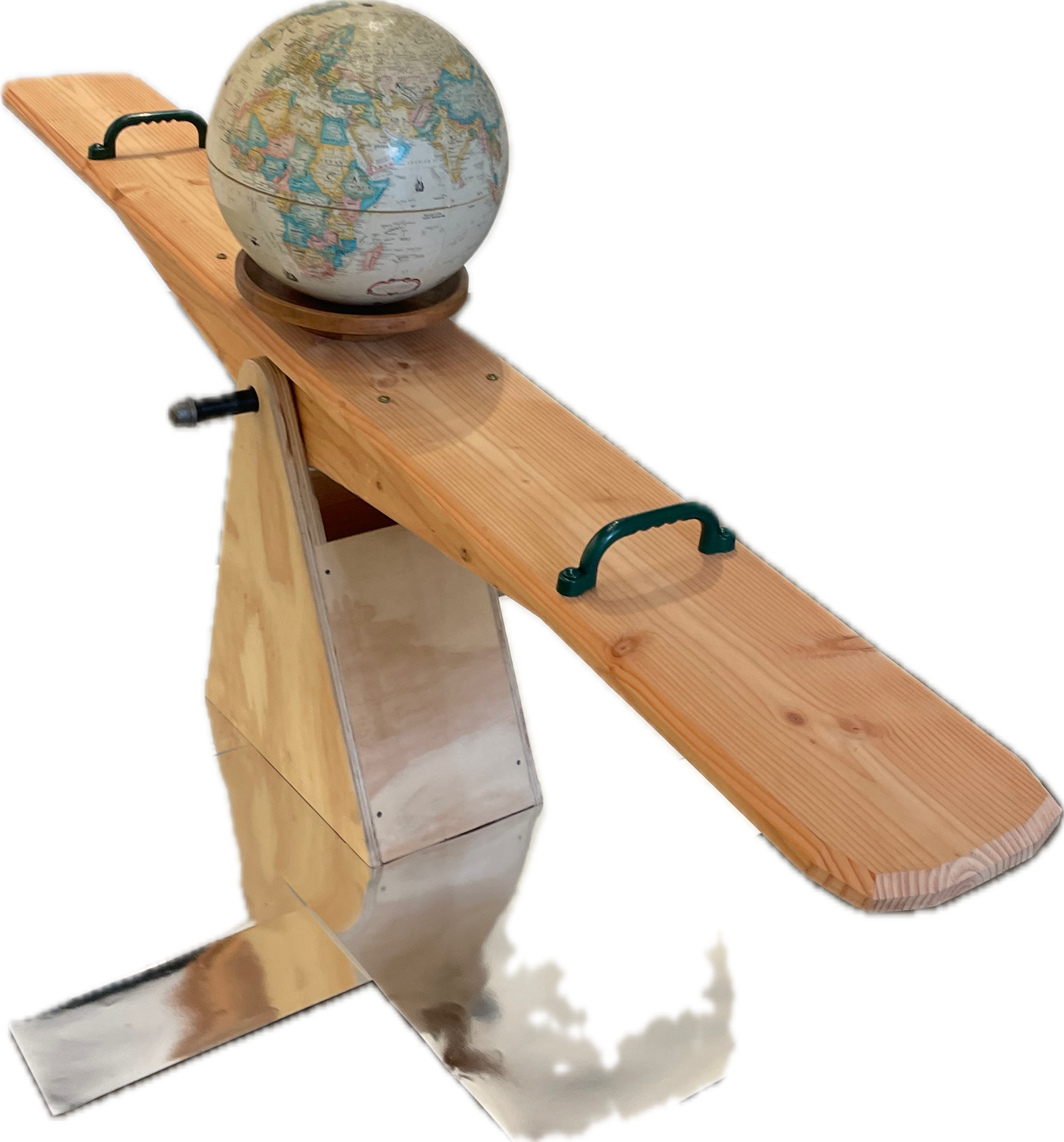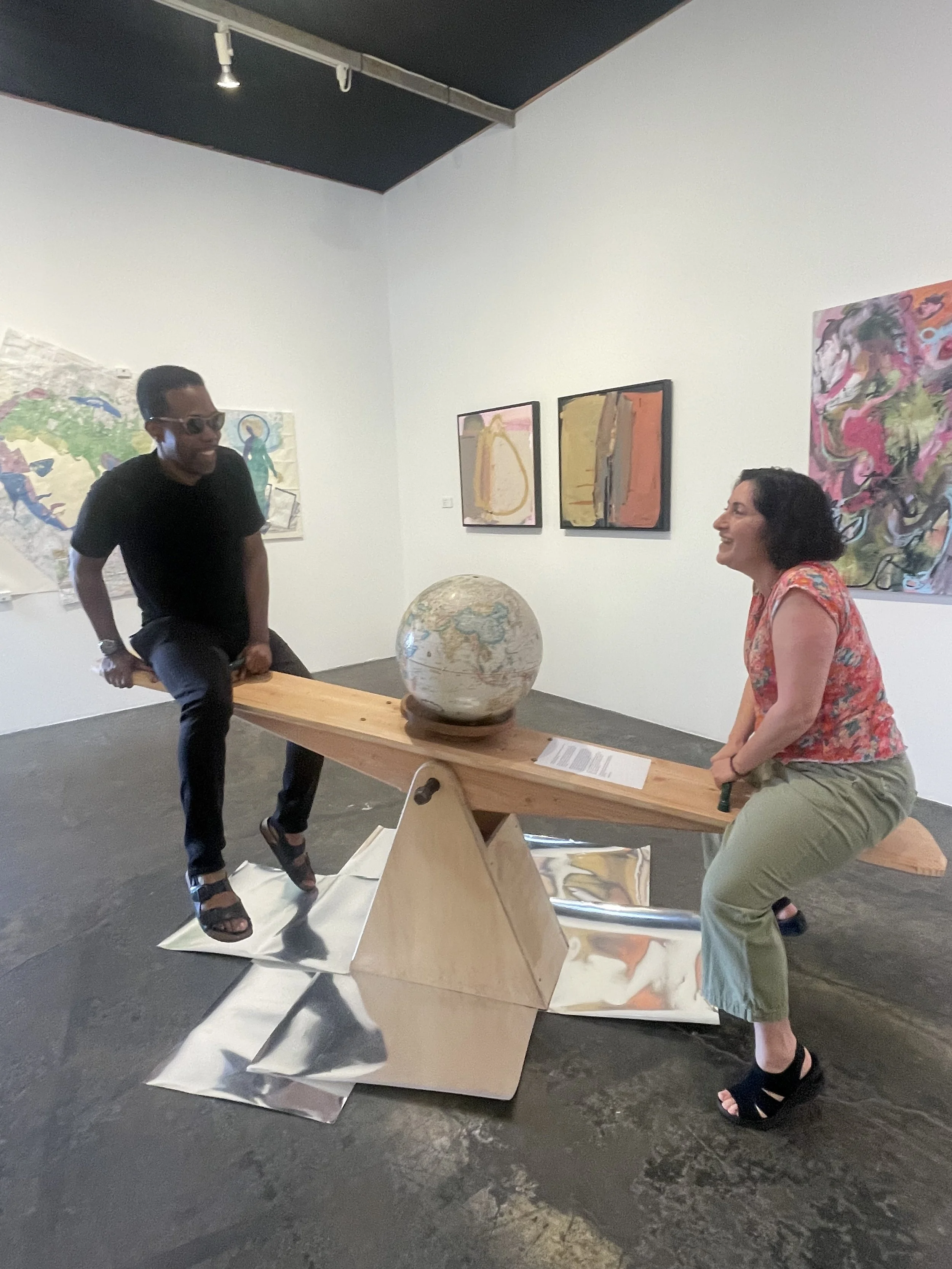 The sea saw installation is an interactive piece balancing a globe, becomes both a literal and symbolic bridge. When participants engage with the piece, they must face one another. This simple act naturally encourages eye contact, conversation, laughter, and shared experience. It invites people to reflect and share a common space and experience. The movement of rising and falling creates a moment of suspension of being lifted from the ground, producing a sensation of weightlessness of being everywhere and nowhere at once, unrooted yet connected.