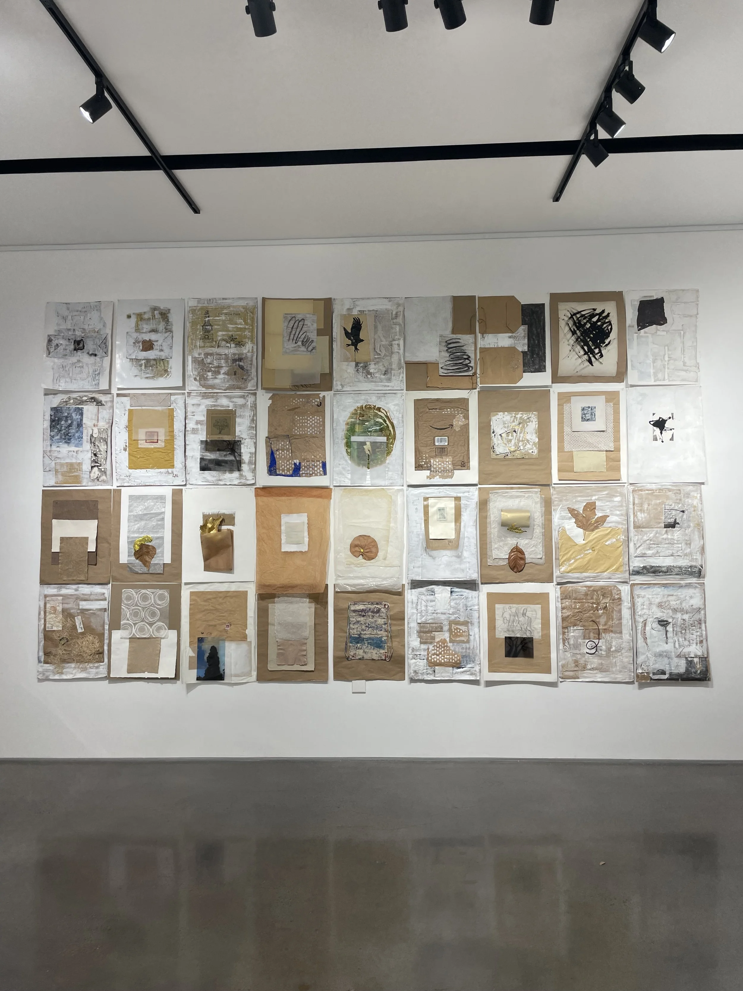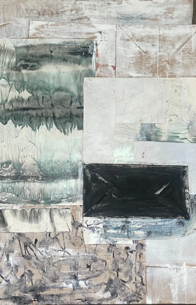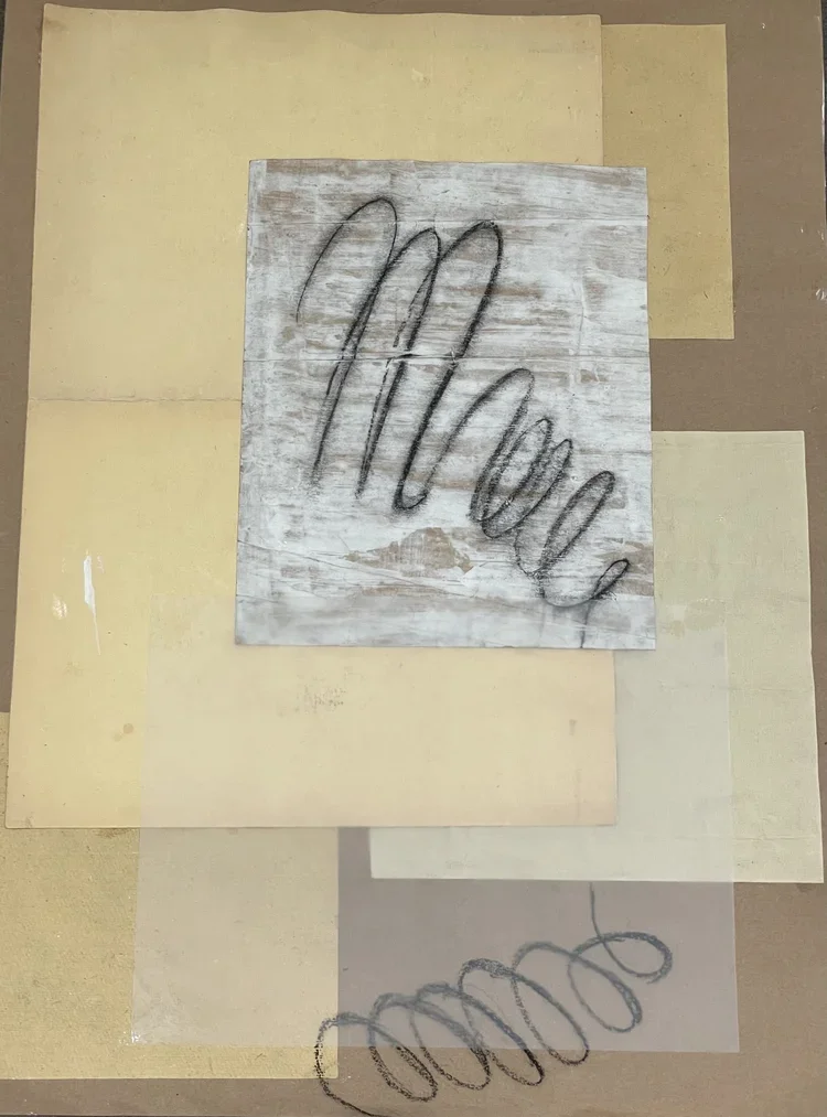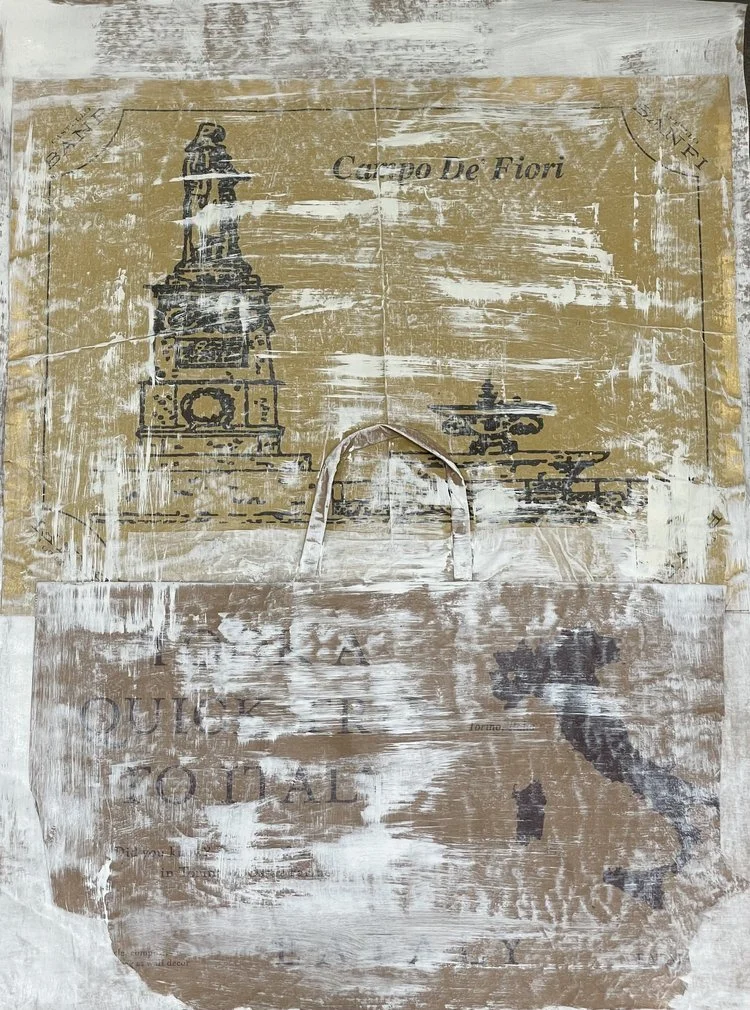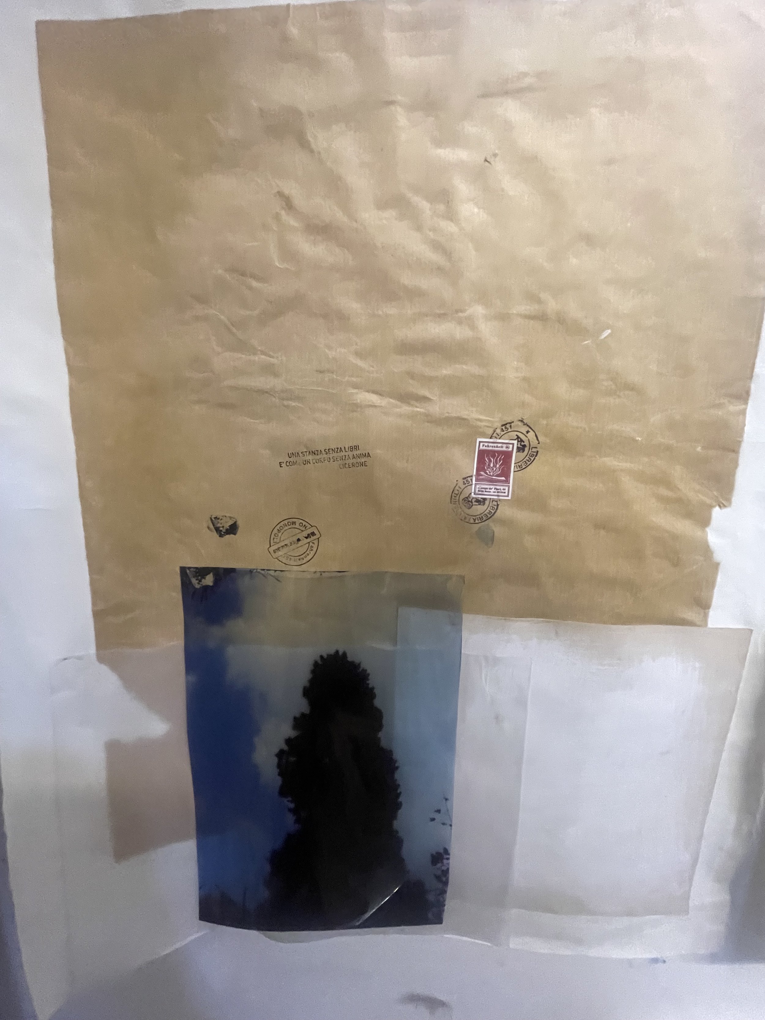 SOMEWHERE EVERYWHERE AND NOWERE (IN BETWEEN), represents past and present. It’s a work started during the pandemic, while in isolation, I began working with these paper fragments. Re-discovered pieces of papers, drawings, scketches, fragments of memories, traces that I carried with me since my living in Italy. It was a kind of meditation, a process of confronting myself and the world we were living in. I didn't know where it would lead, but something within me urged me to use these fragments to explore both my own identity and the collective experience we were all enduring. This catharsis became a way to engaging with both past and present and questioning our survival and our place in the world. What if this had been the end of our sources? This experience made me reconsider my space into the world and the way I connect to it. What emerged was a map, not only physical spaces, but of my own unrooted existence, a map that navigates memories, materials, lost identities, historical references and feeling to be an outsider.