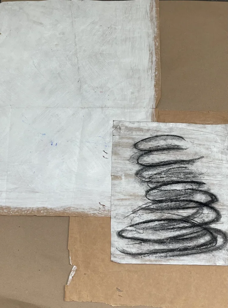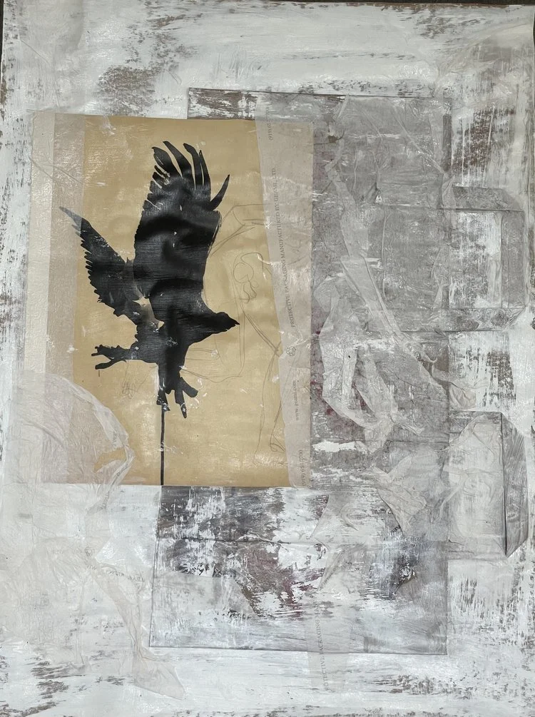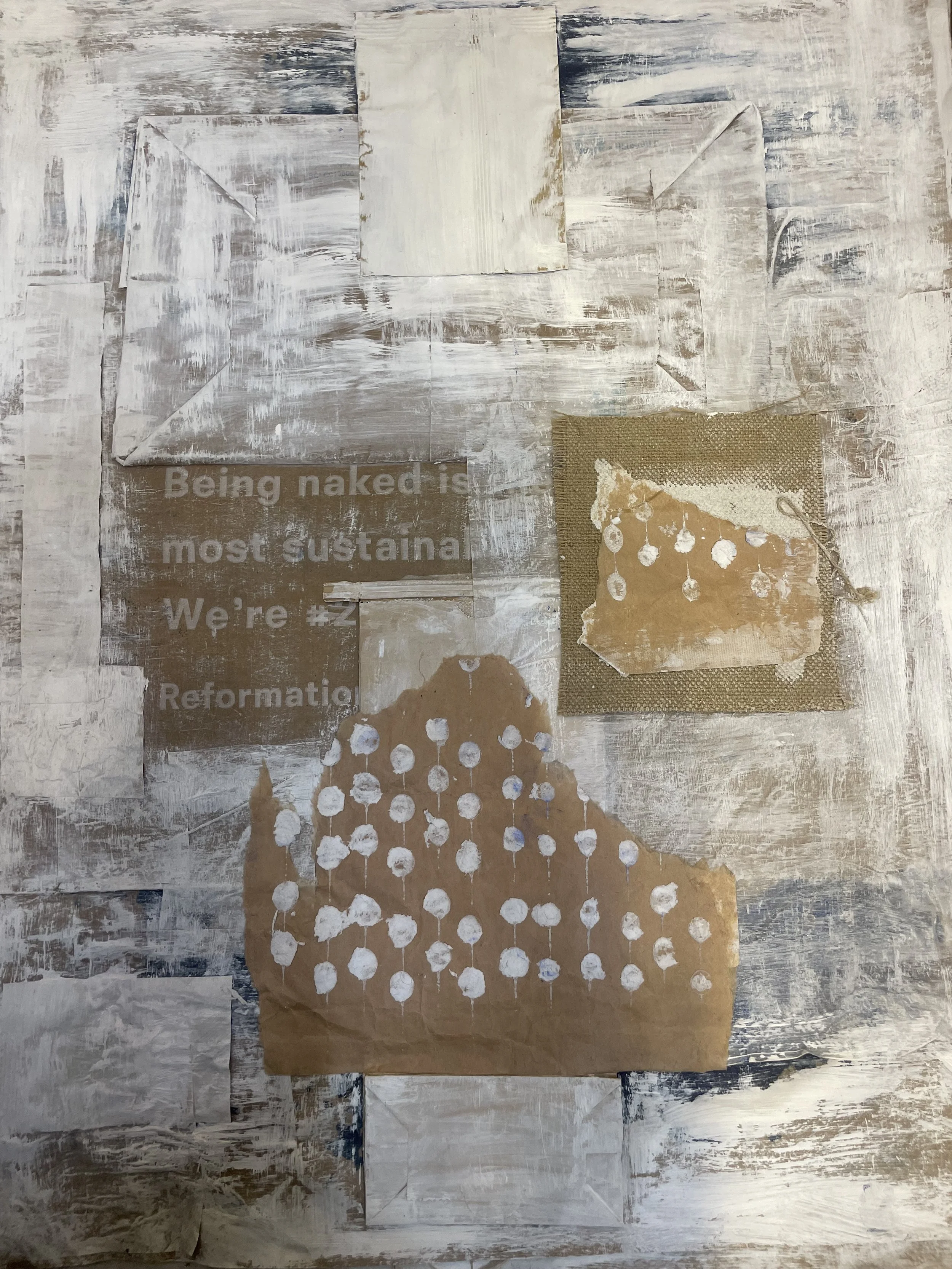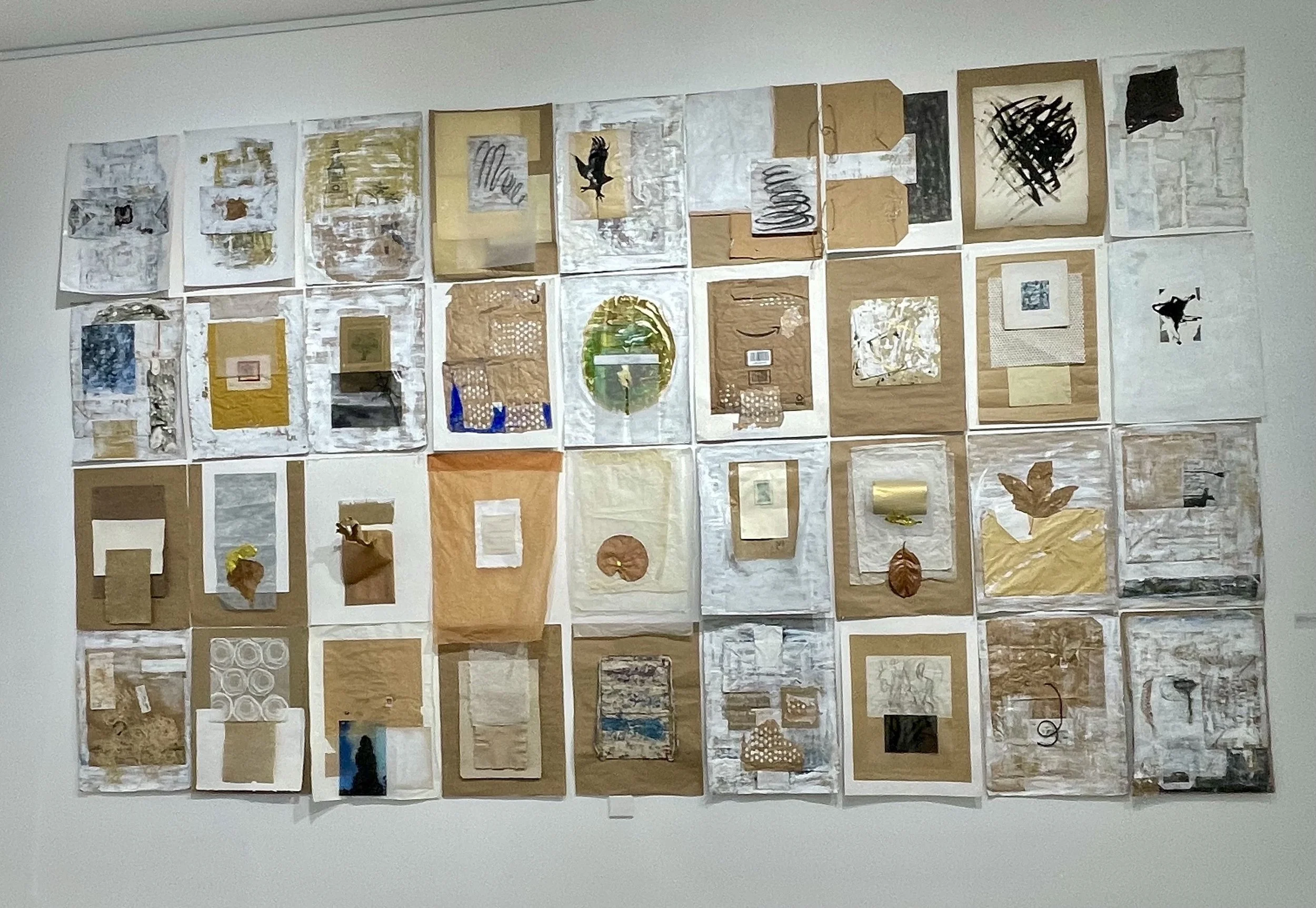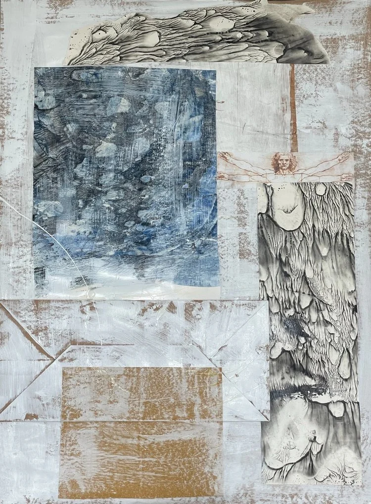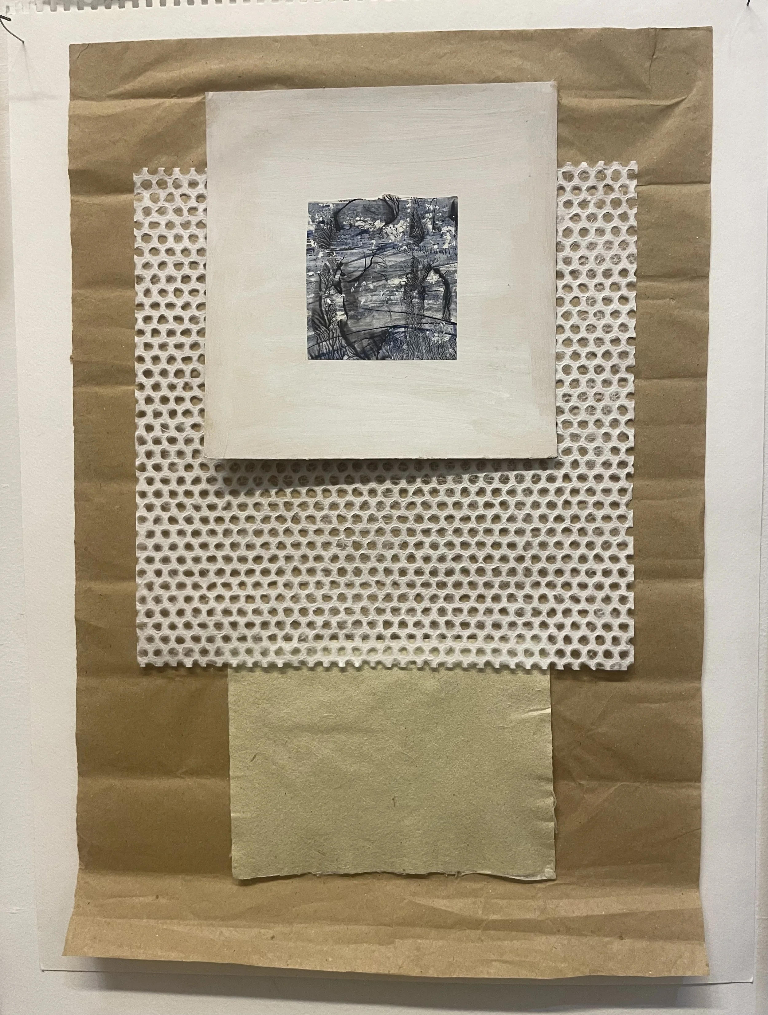 SOMEWHERE EVERYWHERE AND NOWERE (IN BETWEEN), represents past and present. It’s a work started during the pandemic, while in isolation, I began working with these paper fragments. Re-discovered pieces of papers, drawings, scketches, fragments of memories, traces that I carried with me since my living in Italy. It was a kind of meditation, a process of confronting myself and the world we were living in. I didn't know where it would lead, but something within me urged me to use these fragments to explore both my own identity and the collective experience we were all enduring. This catharsis became a way to engaging with both past and present and questioning our survival and our place in the world. What if this had been the end of our sources? This experience made me reconsider my space into the world and the way I connect to it. What emerged was a map, not only physical spaces, but of my own unrooted existence, a map that navigates memories, materials, lost identities, historical references and feeling to be an outsider.
